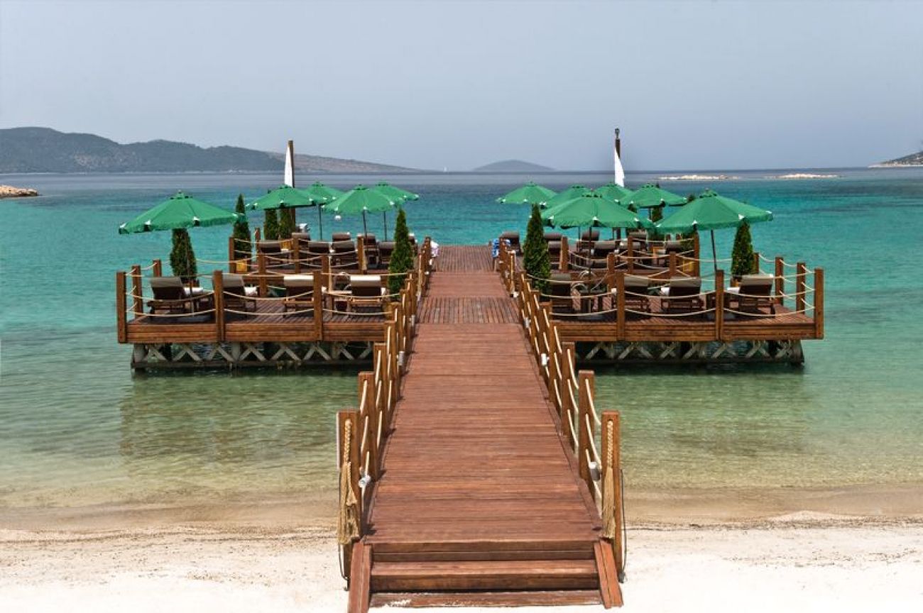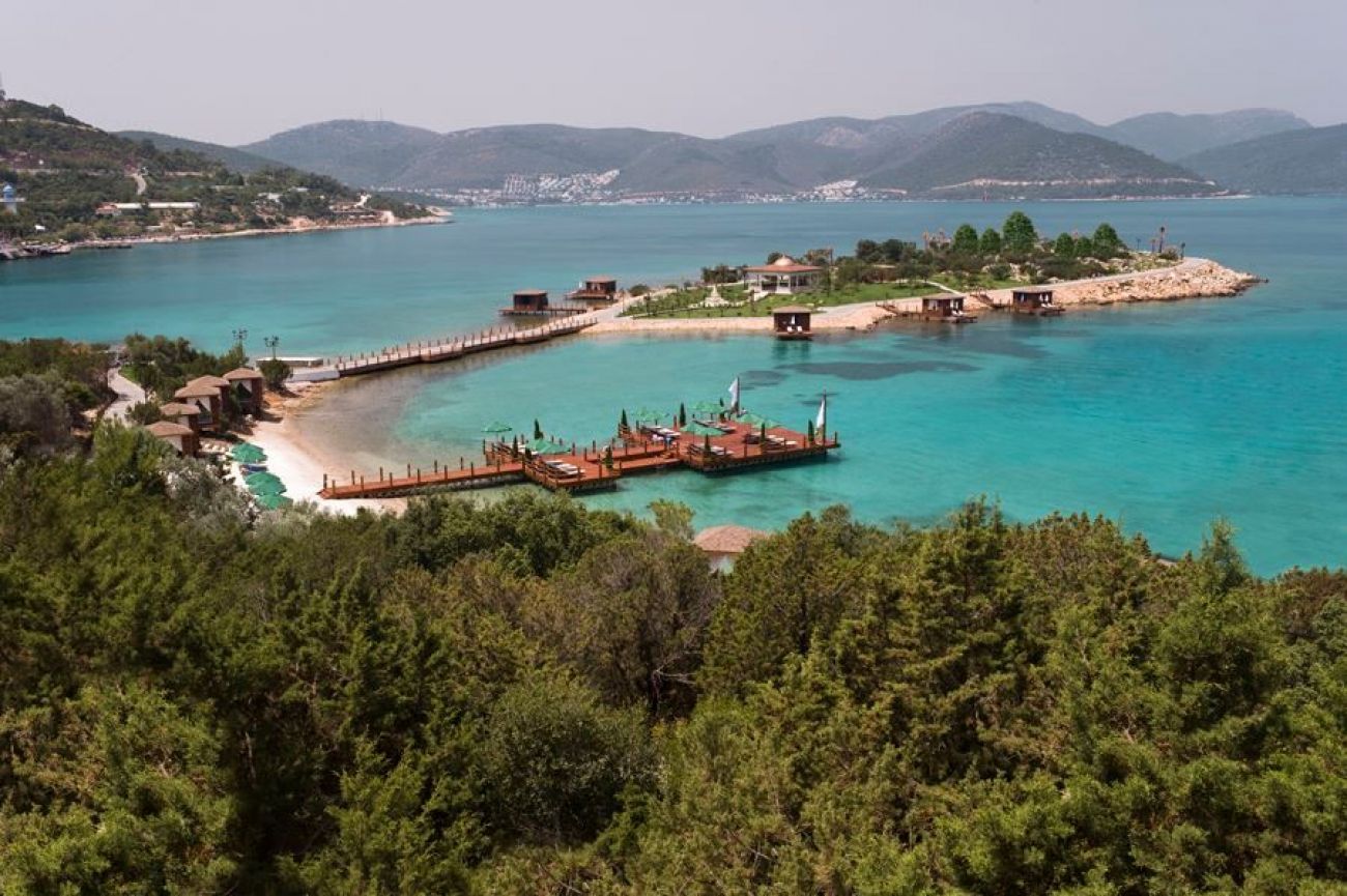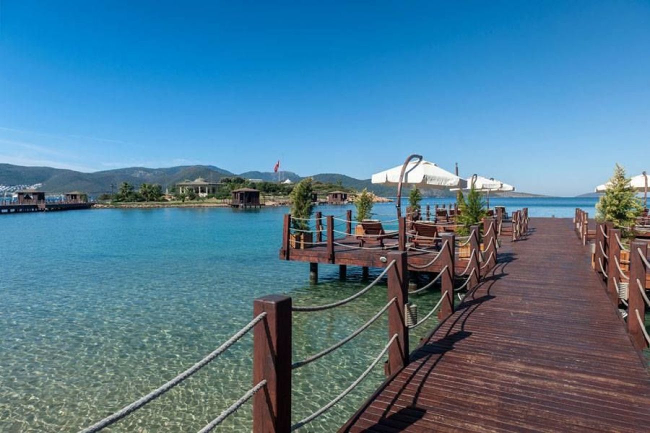 на 25 км от летището и на 10 км от центъра на Бодрум, на 2 км от селището Торба, на брега на морето.