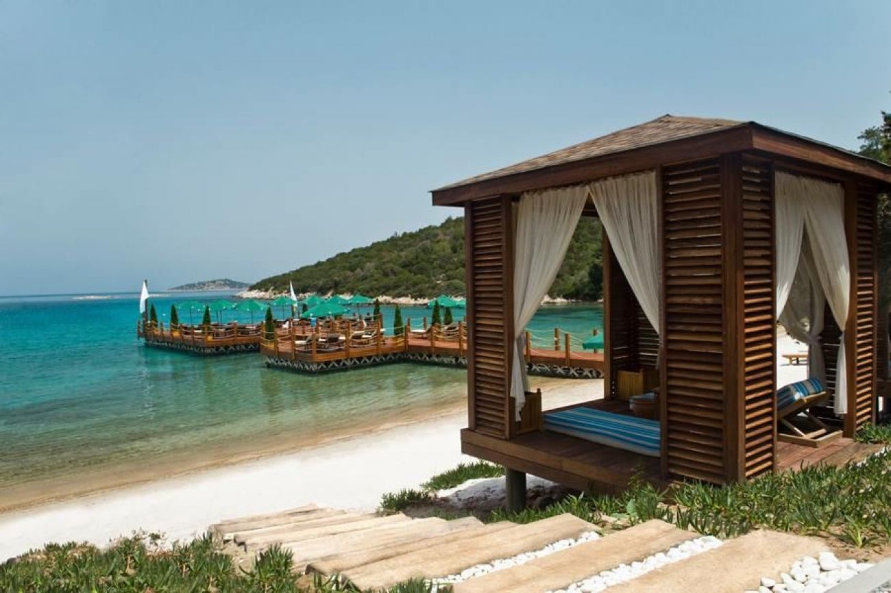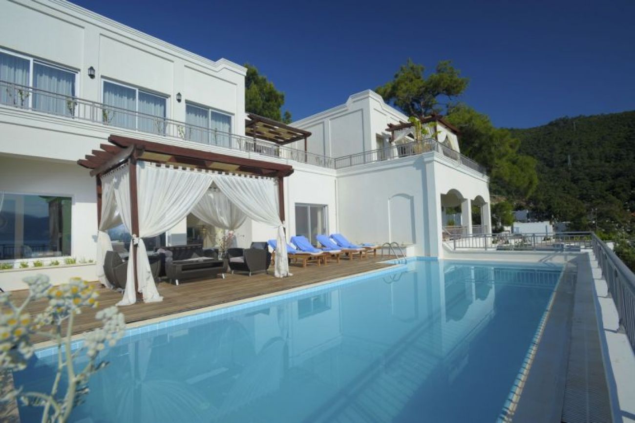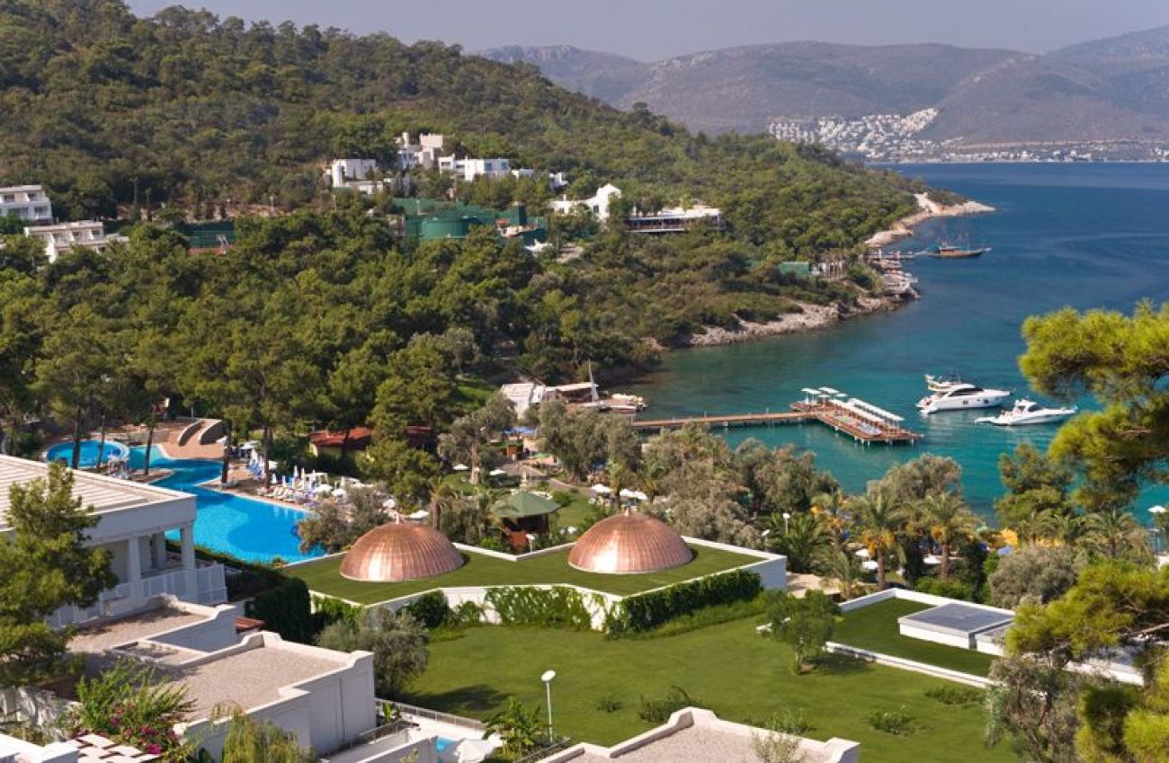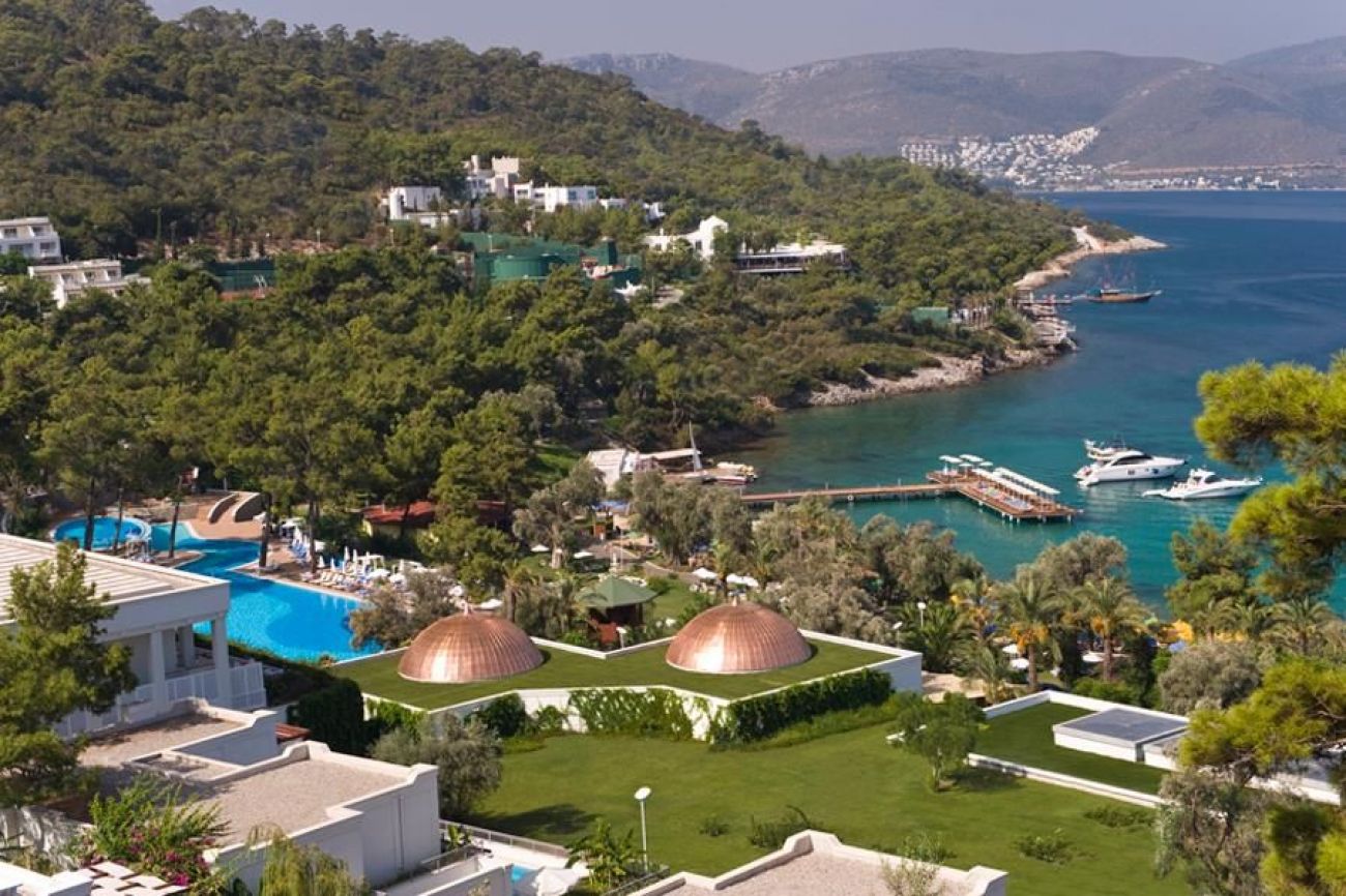 на 25 км от летището и на 10 км от центъра на Бодрум, на 2 км от селището Торба, на брега на морето.