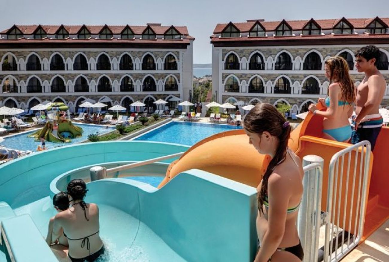 Той предлага частен плаж и открит басейн с водни пързалки.