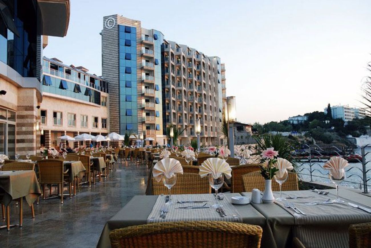 На 75 км от летището в гр. Измир, 500 м от центъра на Кушадасъ, на брега на морето със собствен каменист плаж. Открит през 2006 г.
