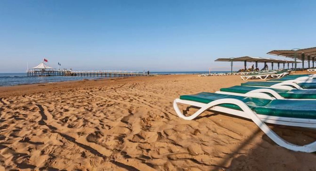 Собствен, пясъчен. Кей. Бар на плажа - безплатно. При басейна и на плажа - чадъри, шезлонги, матраци – безплатно. Плажни кърпи: безплатно.