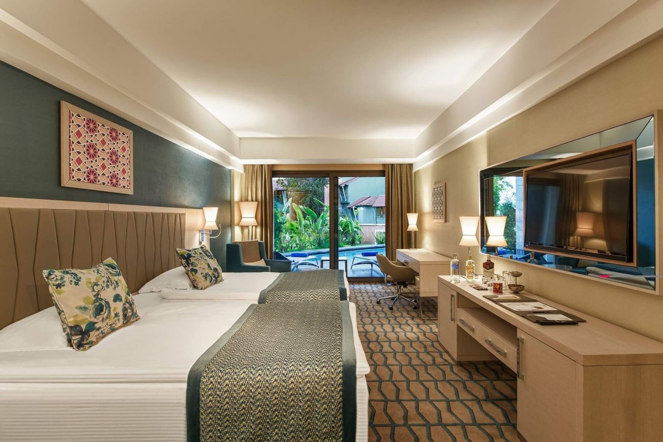 Хотелът се състои от една 4-етажна основна сграда, пет 2 и 3-етажни клубни сгради и четири 5-етажни сгради делукс. Всички стаи разполагат с балкон/тераса, климатик, телевизор със сателитна телевизия, телефон, баня с душ, принадлежности за баня, сешоар, мини бар (зарежда се един път на ден с вода и безалкохолни напитки), сейф (безплатен). Почистване на стаите - всеки ден, смяна на спално бельо - 3 пъти седмично.