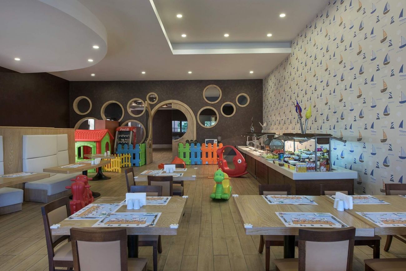 детски бюфет (обяд и вечеря), детски басейн, 2 детски водни пързалки, детска площадка, мини-клуб (4-8 години), джуниър-клуб (9-14 години), детска количка (платено), детегледачка (платено)