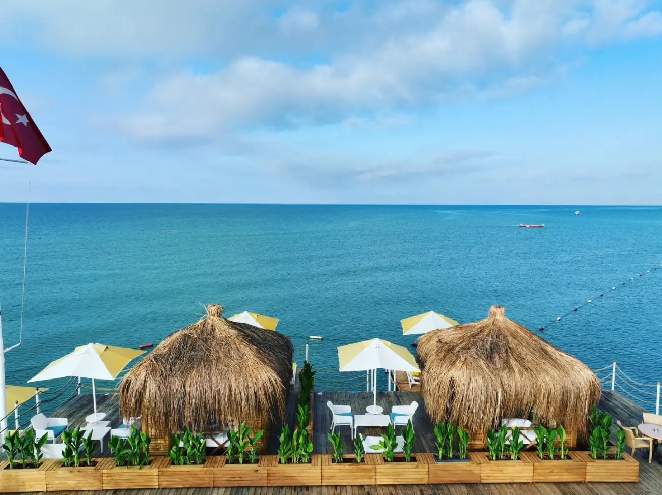 собствен - пясъчен. Шезлонги, матраци и чадъри на плажа и басейните - безплатно.
