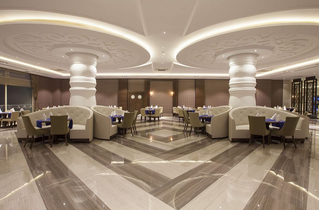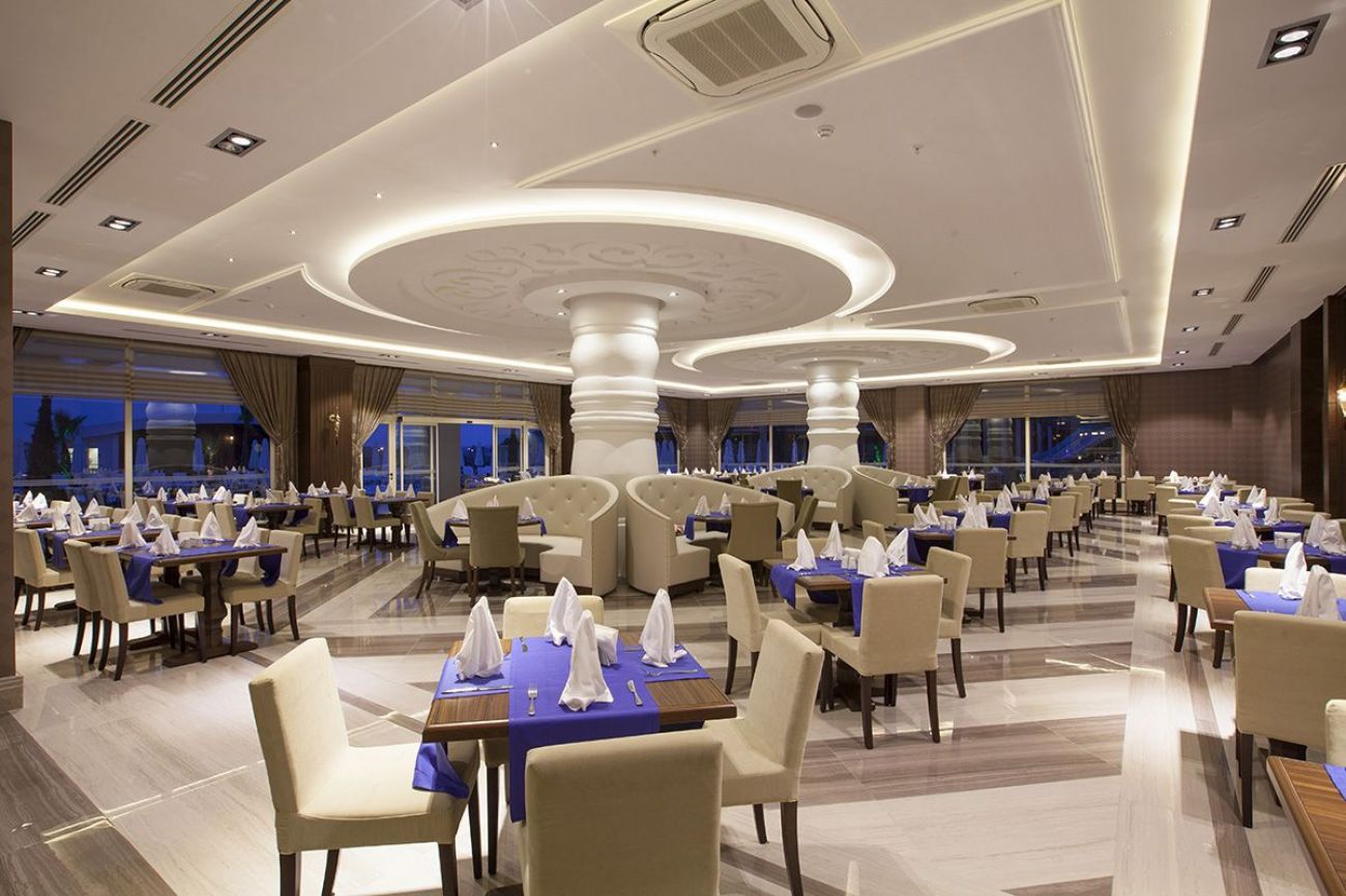 Работно време на основния ресторант: Закуска 07:00 – 10:00, късна закуска 10:00 – 11:00, обяд 12:30 – 14:00, леки закуски (в Beach Snack Restaurant) 12:00 – 15:00, чай /кафе/печени изделия (във фоайето) 16:00 – 17:00, вечеря 19:00-21:00, късна вечеря (супа) 23:00 - 00:00, мини бюфет 23:00 - 07:00.